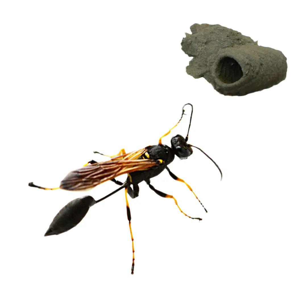 Mud dauber wasps are solitary insects known for building mud nests on walls, ceilings, and other structures. They are non-aggressive and help control spider populations.